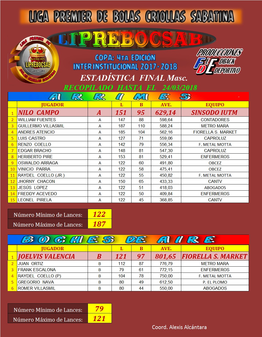 Jean C Gzlz. 12/8 y Rizzio Rodríguez con 30/19 en arrimes; mientras que en los